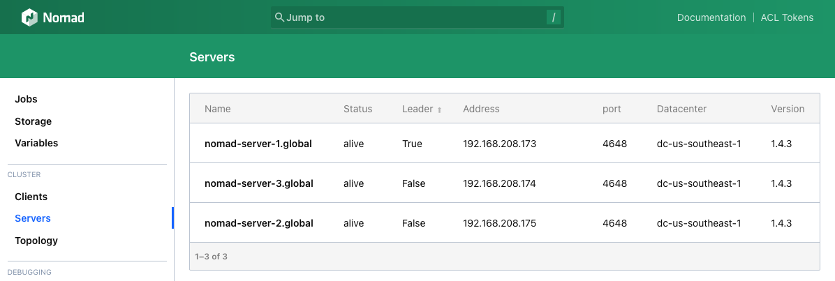 6. Use the left-hand menu to navigate to the Server page to see a list of the Nomad servers deployed in the cluster: